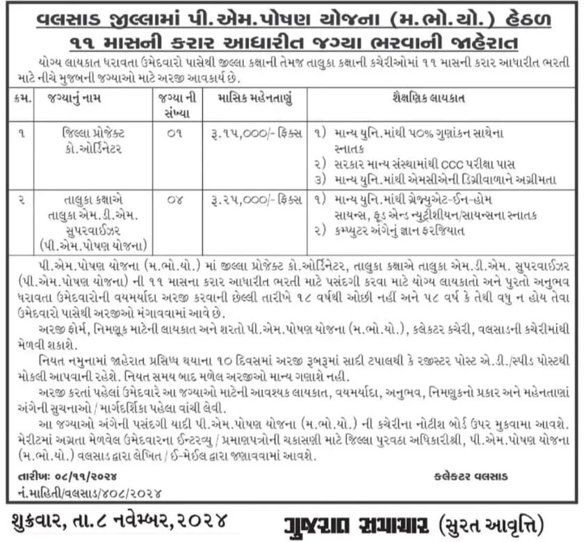 મીડ ડે મીલ વલસાડ દ્વારા જાહેર કરવામાં આવેલ ભરતી નોટિફિકેશન માં જિલ્લા પ્રોજેક્ટ કોઓર્ડીનેટર અને તાલુકા મીટ ડે મીલ સુપરવાઇઝર ની જગ્યા માટે અરજીઓ મંગાવવામાં આવી રહી છે. આ ભરતી અભિયાનમાં જિલ્લા પ્રોજેક્ટ કોઓર્ડીનેટર ની 1 જગ્યા છે અને તાલુકા MDM સુપરવાઇઝરની 4 જગ્યા છે. આમ આ ભરતી નોટિફિકેશનમાં કુલ પાંચ જગ્યા માટે અરજી મંગાવવામાં આવેલ છે. આ ભરતીમાં અરજી કરવા માંગતા ઉમેદવારો ઓફલાઈન અરજી કરી શકે છે. અહીં અરજી કરવાની છેલ્લી તારીખ 18 નવેમ્બર 2024 એટલે કે આવતીકાલ એ અરજી કરવાનો છેલ્લો દિવસ છે. અરજી કરતાં પહેલાં નીચે જણાવેલી વિગતો ધ્યાન પૂર્વક વાંચો.